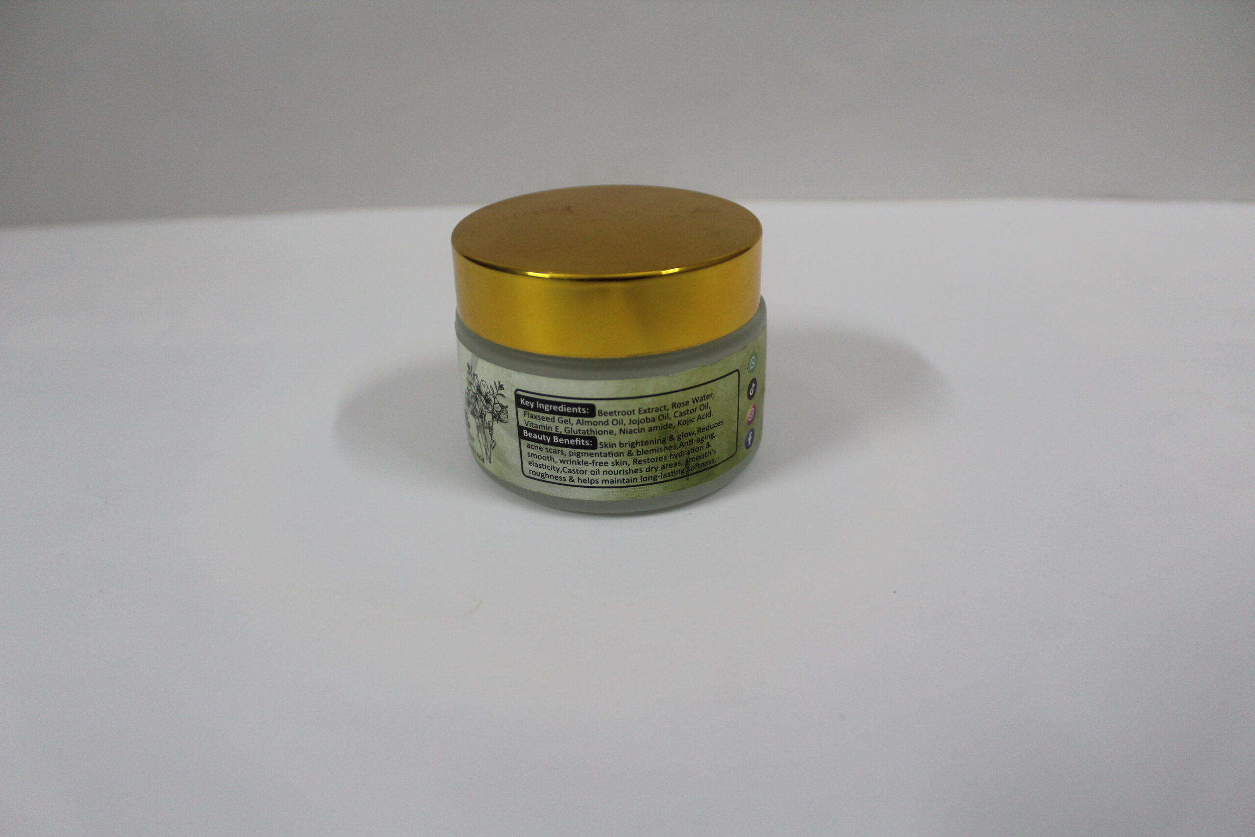 Powered by beetroot + herbal oils, and enriched with Glutathione + Niacinamide, this cream supports a brighter, more even-looking tone — leaving your skin soft, youthful, and deeply nourished every day.